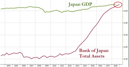 The Bank of Japan (their Central Bank) has been propping up the Japanese economy since the late 1990s. By suppressing the value of their currency for cheap exports, combined with propping up insolvent banks still wasn’t enough to help their economy. So the Bank of Japan continued printing more and more money to: pay unaffordable public pensions; prop up their bond market; and finally, propping up their stock market. The Bank of Japan just hit a new record on November 10th. The Bank of Japan has a balance sheet as large as the country’s annual GDP, 552.8 trillion yen. This means Japan’s central bank has printed so much extra money it has been able to purchase a year of the country’s output. The Japanese central bank’s debt to GDP ratio is an unheard of 253% (as a comparison, the U.S. is 20%). The central bank has been taking this extra money printing and not only buying bonds with it (to reduce interest rates), but buying Japanese Stocks (through exchange-traded funds). The Bank of Japan has bought so much stock that it now owns 55% of the outstanding shares of Japanese public companies!